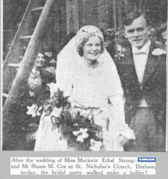 Shaun Maturin COX, born about 1914 in Howth, Co Dublin. He qualified from Trinity College, Dublin, in 1934 with a degree in Experimental Science. Shaun married Marjorie Ethel STRONG-HECKLES on Friday 13 Nov 1936 at St Nicholas' church in Durham; to ward off any bad luck the couple immediately walked under the pictured ladder. Marjorie was the youngest daughter of Lynn Strong-Heckes, Durham. Shaun was Manager of J.A. Jobling & Co, Sunderland (UK manufacturers of Pyrex glass) and was awarded an OBE on 9 Jun 1949 for his research into the manufacture of coloured pyrex. He died in 1979 and Marjorie in 1997. They are both buried in Harton Cemetery, South Shields.