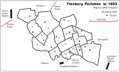 36) Parishes of Finsbury in 1903 map http://homepages.gold.ac.uk/genuki/MDX/Finsbury/outline.htm again by kind permission of David Hawgood and Genuki - available online