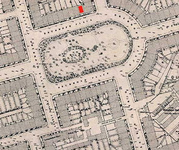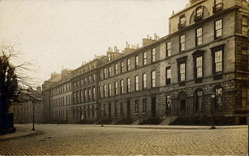 29 Drummond Place, Edinburgh New Town is at the second set of steps from the right . © Postcard photo by kind permission of Peter Stubbs at www.edinphoto.org.uk. No 29 is marked in red on the 1872 map